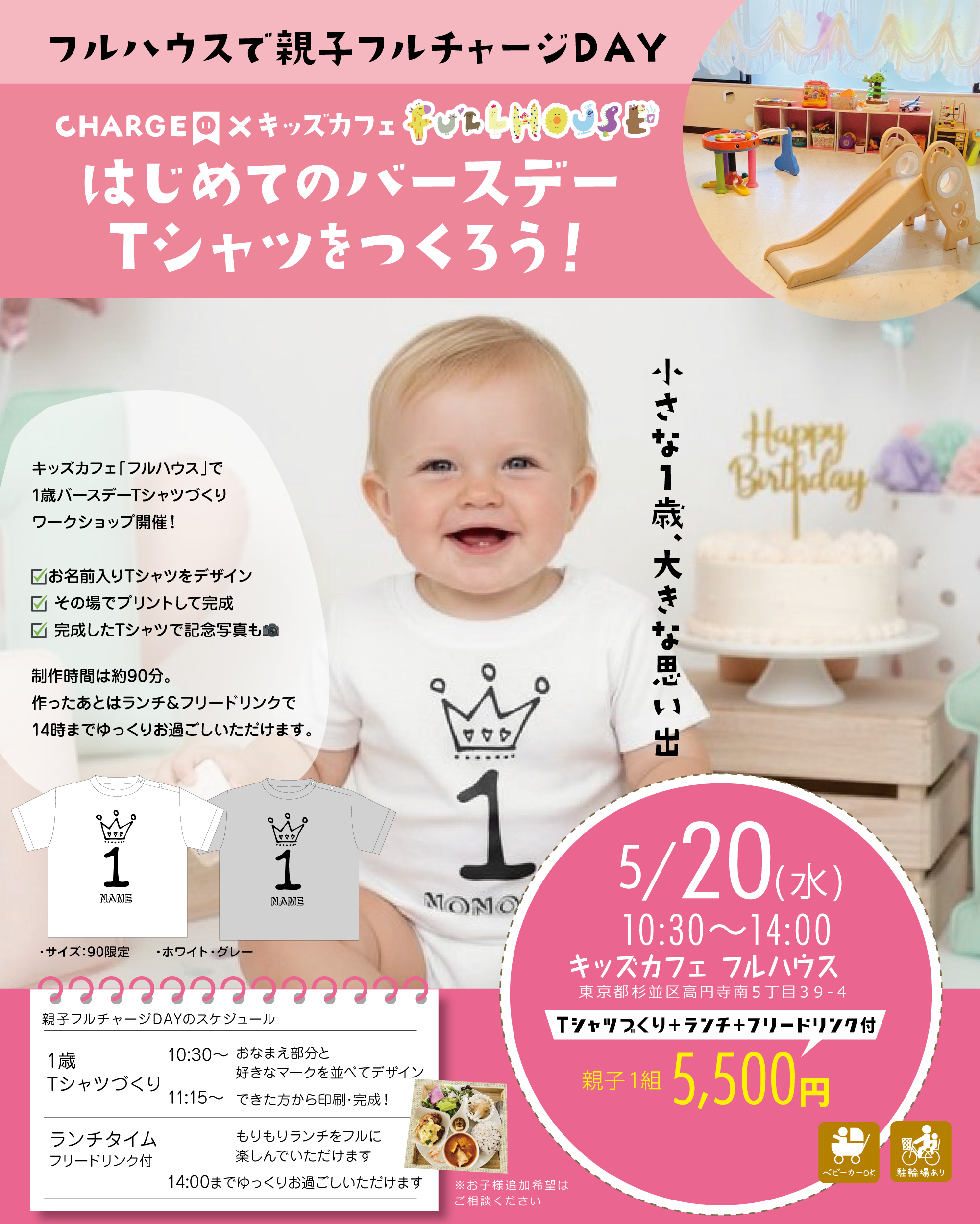 イベント情報 フルハウスで親子フルチャージDAY はじめてのバースデーTをつくろう 2026.5/20(水) 10:30〜14:00 チャージ高円寺とはじめてのコラボイベントになります 是非みなさんのご参加をお待ちしております お弁当のご予約については LINE にてご相談ください フルハウスのお弁当が中野駅からスグ! 中野ブロードウェイでも買えます。 ▲ご予約は LINEのみで受付してます 残席情報 予約・相談窓口 お知らせ お知らせ